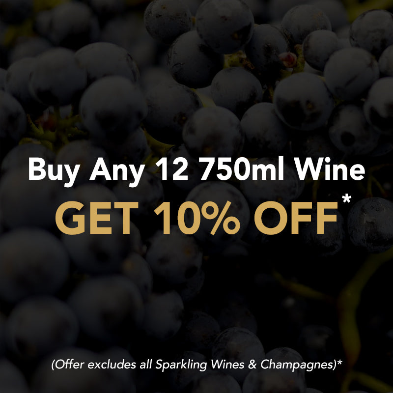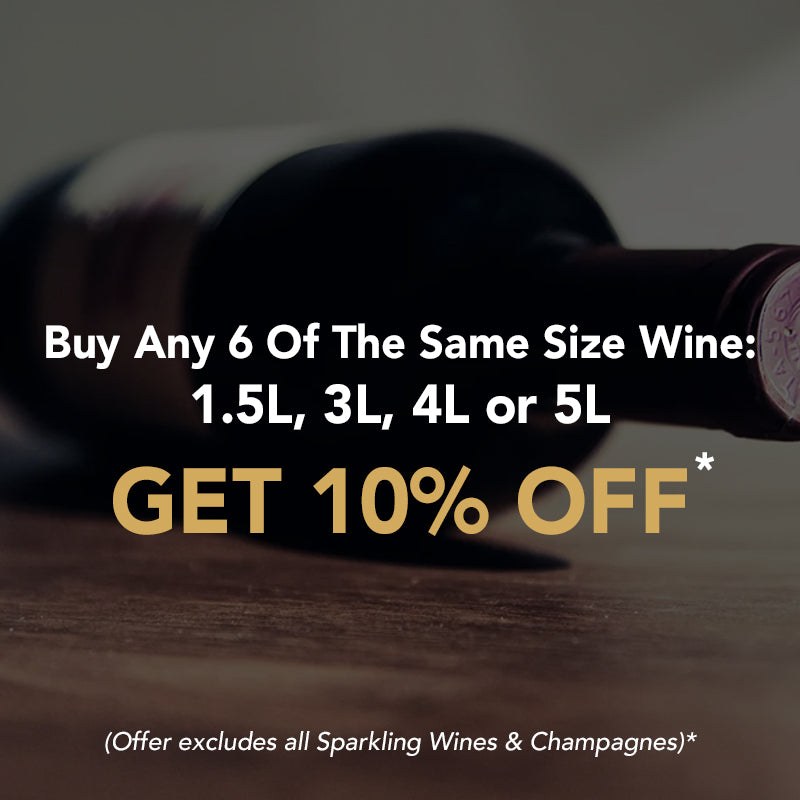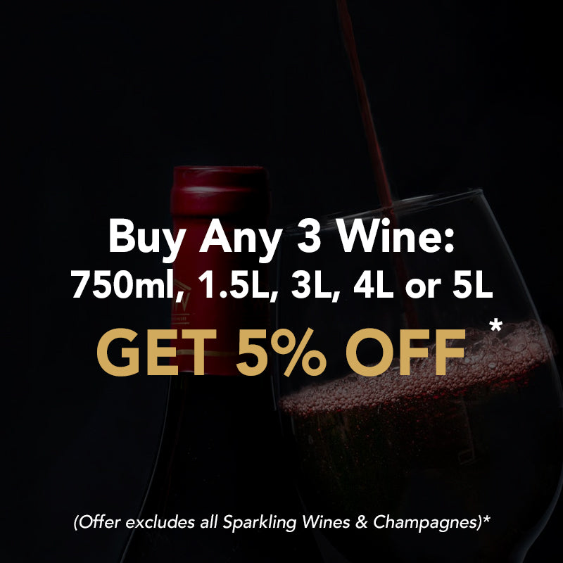 Buy any 3 bottles of 750ml, 1.5L, 3L, 4L or 5L Wine and GET 5% OFF. Buy any 12 bottles 750ml Wine and GET 10% OFF. Buy any 6 bottles of the same size: 1.5L, 3L, 4L or 5L Wines and GET 10% OFF.